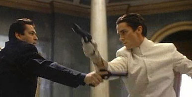 ![]() John Preston (Christian Bale, wearing white) uses gun kata on an opponent. |